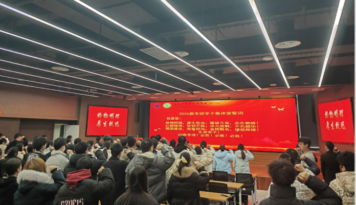 在激昂的氛围中,全体考研学子庄严宣誓:“格物明理,厚生致远;笔破万卷,志在巅峰!红柳精神,坚韧不拔;淬火成钢,不负韶华.....”铿锵誓言响彻会场,展现了生命学子勇攀高峰的坚定信念。