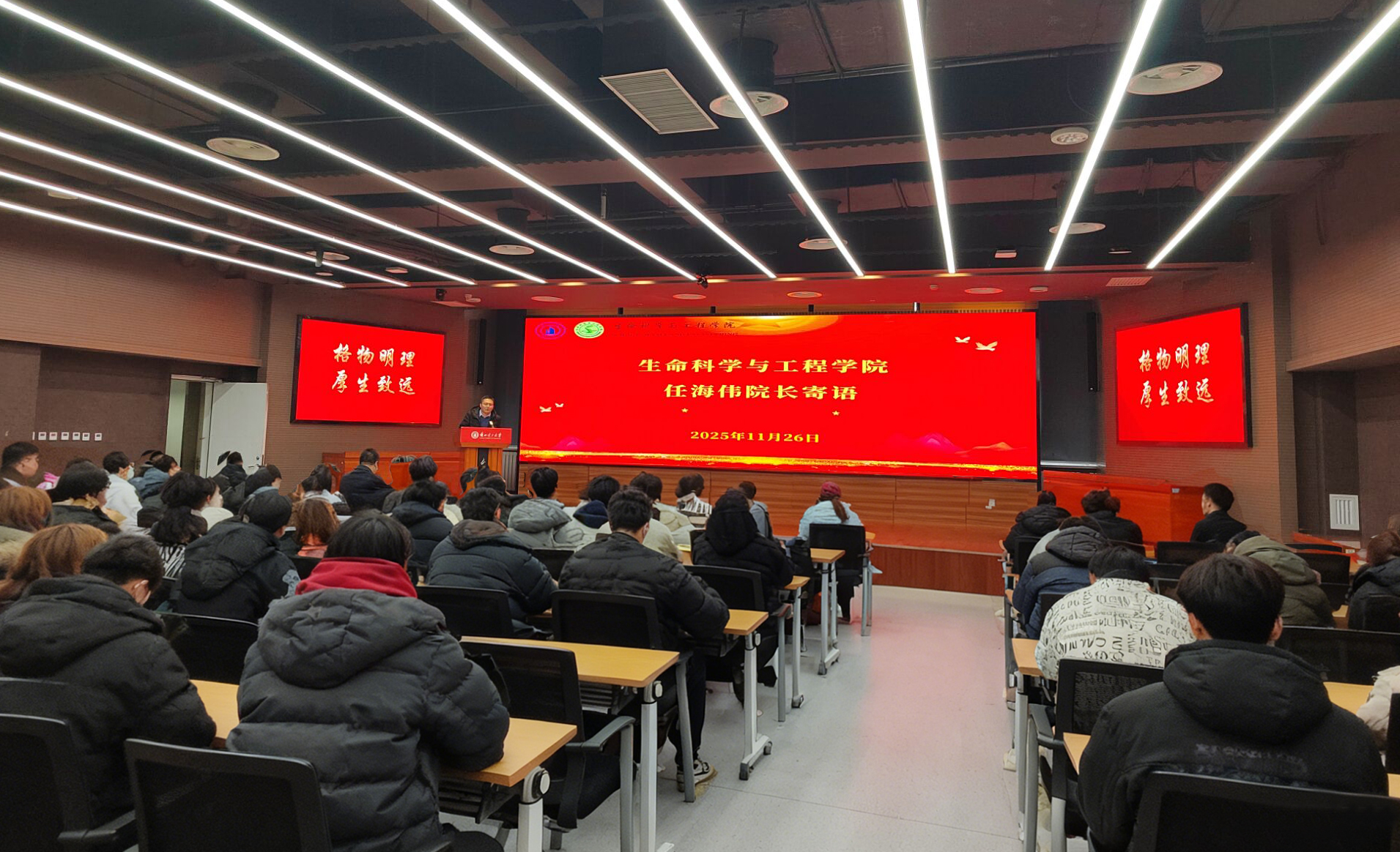 为2026届考研学子冲刺助力,为其坚定信念铸魂,11月26日,生命科学与工程学院在彭家坪校区图书馆109报告厅开展“情系考研学子,笃行立德树人”考研冲刺誓师大会暨暖心慰问活动。学院领导班子、各系主任、导师代表、辅导员、毕业班班主任及全体2026届考研学子参加会议。会议由学院党委副书记王亚伟主持。