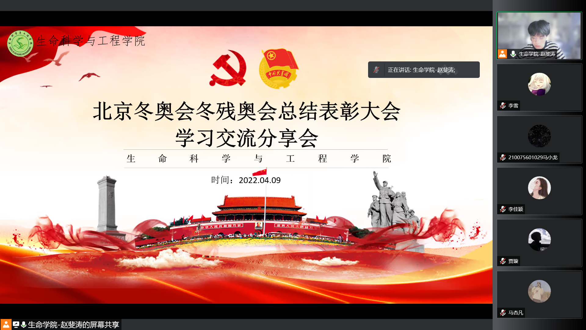 冬奥会和冬奥残会圆满结束,学院于2022年4月17日19:00在腾讯会议举行习近平总书记在《北京冬奥会、冬残奥会总结表彰大会上的讲话》精神学习活动。生命学院学生会全体成员参与此次活动。