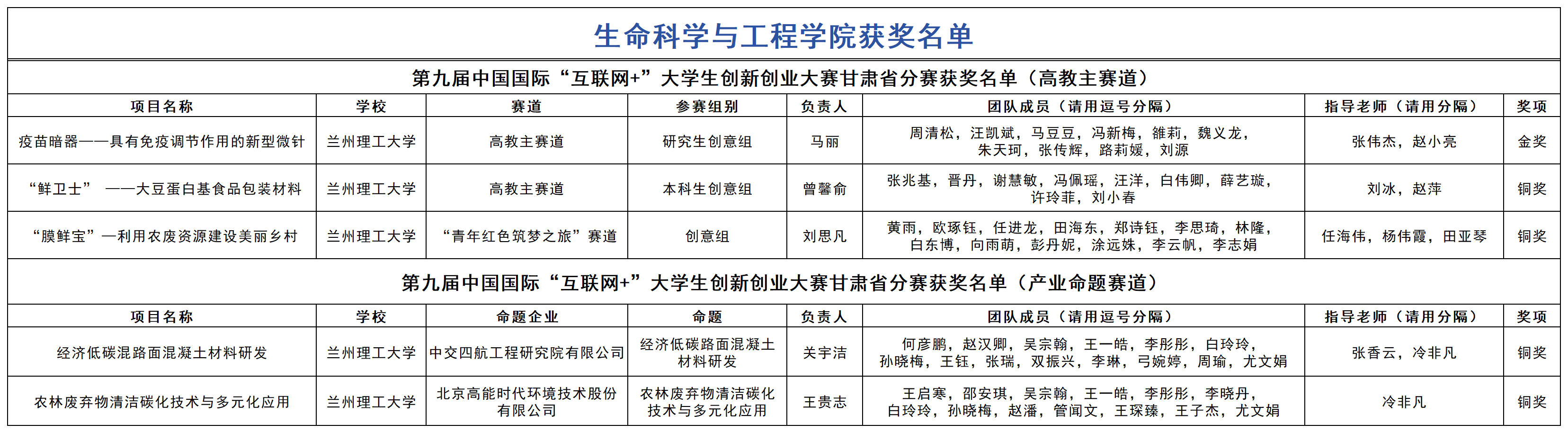 近日,由甘肃省教育厅主办、甘肃农业大学承办的第九届中国国际“互联网+”大学生创新创业大赛甘肃省分赛决赛在兰州新区职教园区举行。生命科学与工程学院学子在本次大赛中共获得金奖1项和铜奖4项。其中,由张伟杰和赵小亮老师指导,2022级药学专业研究生马丽同学负责的《疫苗暗器——具有免疫调节作用的新型微针》项目获得高教主赛道研究生组金奖;由任海伟、杨伟霞、田亚琴指导,刘思凡负责的《“膜鲜宝”—利用农废资源建设美丽乡村》获得“青年红色筑梦之旅”赛道铜奖;由刘冰、赵萍指导,曾馨俞负责的《“鲜卫士”——大豆蛋白基食品包装材料》获得高教主赛道本科生组铜奖;由冷非凡指导,王贵志负责的《农林废弃物清洁碳化技术与多元化应用》获得产业命题赛道铜奖。各参赛团队在校赛和省赛阶段仔细打磨作品材料,指导教师从思路确定、前期筹备、实验制作、数据分析、项目优化等方面全程指导,师生密切配合,共同完成了本次竞赛。生命科学与工程学院将继续以“互联网+”大赛为牵引,以赛促创,以赛促学,以赛促教,全面深化创新创业教育,进一步激发学生的创新创业意识,提高师生创新创业能力,将创新创业融入人才培养全过程,推动人才培养质量不断提升。