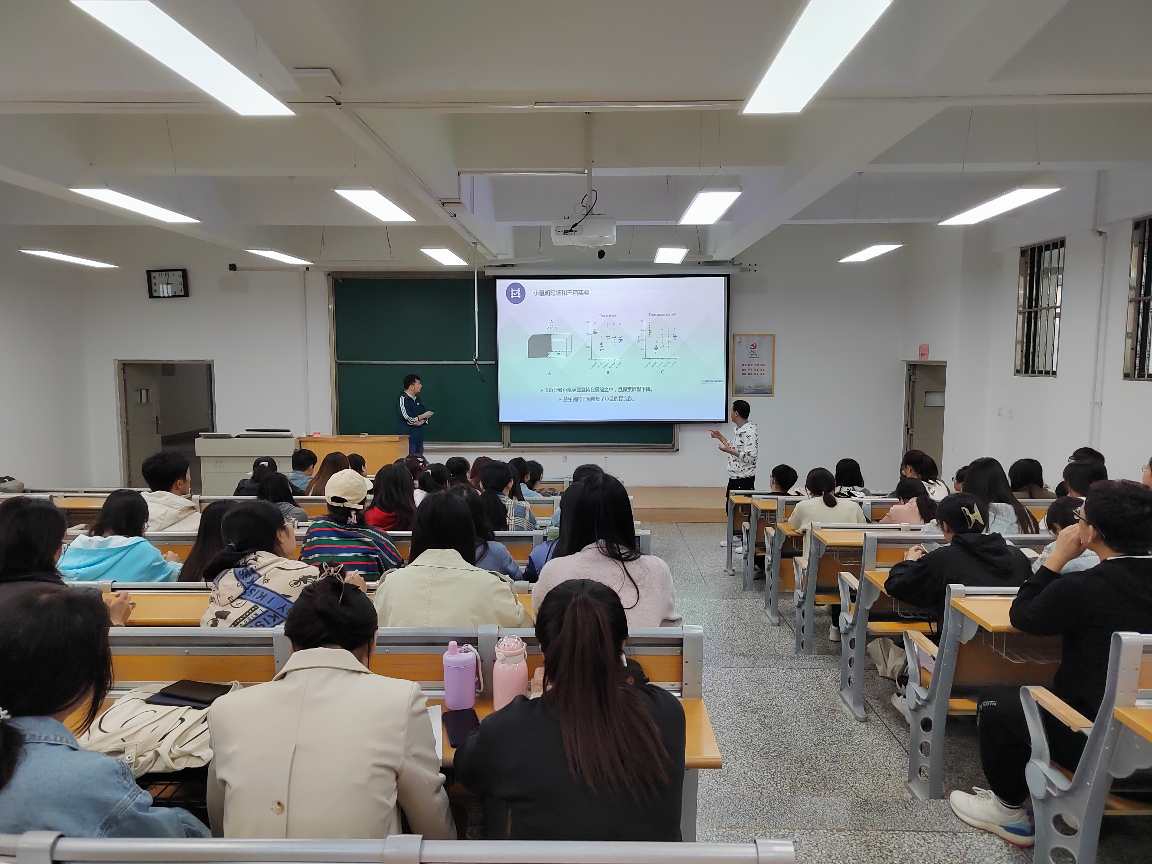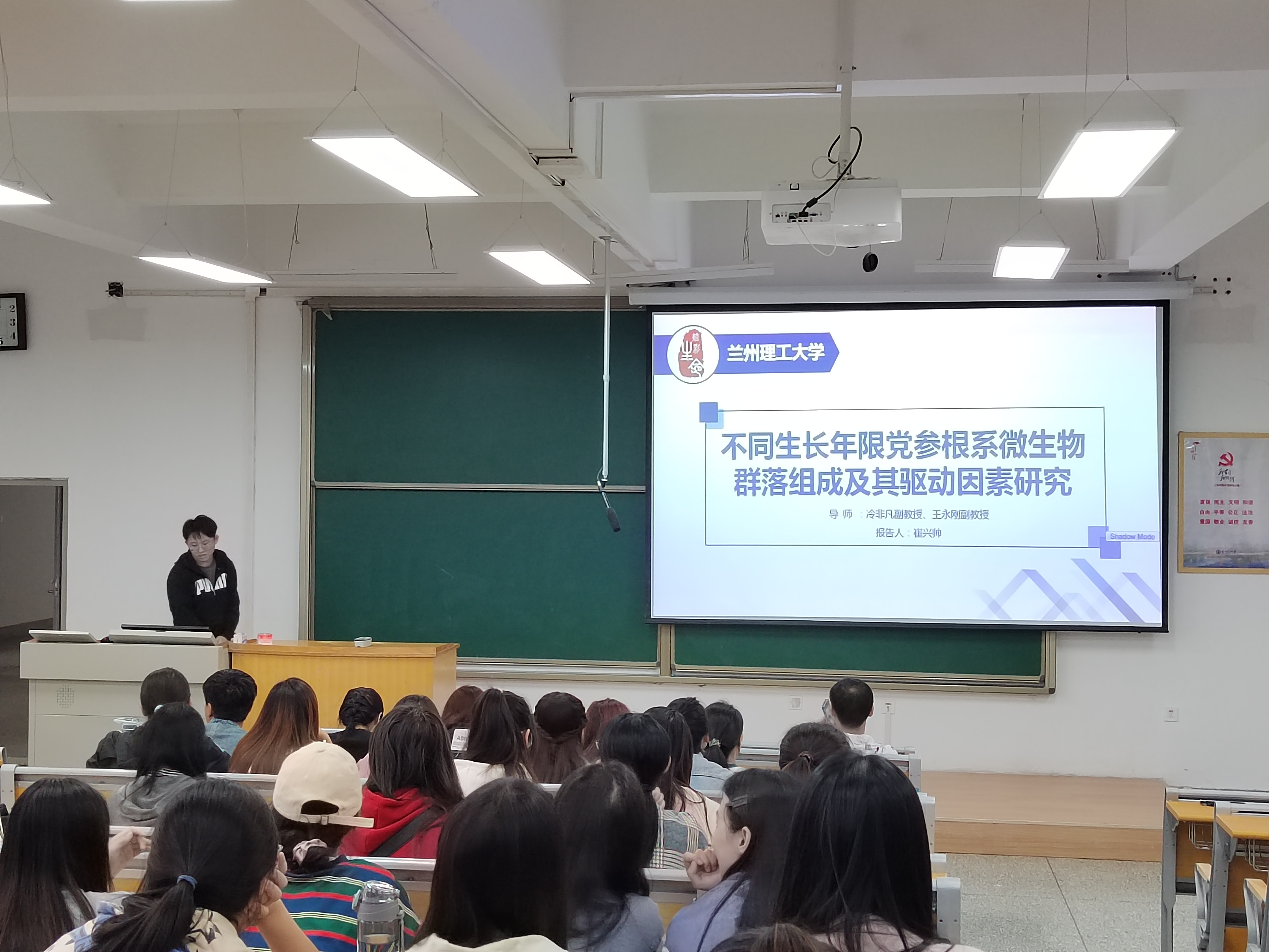 冷非凡老师首先介绍了两位报告人的个人情况及在学术研究上所取得的成就。赵洪源博士从肠炎和抑郁症与我们日常生活的关系出发,详细介绍了益生菌通过肠脑轴缓解肠炎性抑郁症的机制,并由此引出在该方向上的科学研究思路和具体的实施方法,同时向大家介绍了鼠李糖乳杆菌在动物层面缓解抑郁症的实例;崔兴帅同学从多年生党参品质差异出发,详细介绍了不同生长年限党参根系微生物群落的组成差异,以及土壤营养组分对微生物多样性的影响,同时向大家介绍了关于微生物组学的分析方法。报告结束后,参会师生与两位报告人积极互动,就科研中遇到的问题和未来的研究方向进行了热烈的讨论交流。