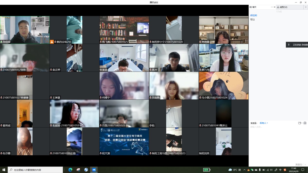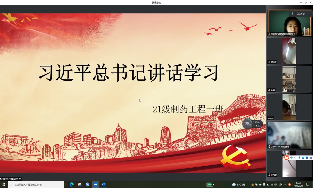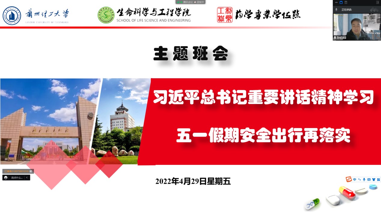 2022年4月29日17:30生命科学与工程学院21级制药工程一班通过腾讯会议的方式召开了学习“习近平总书记视察中国人民大学重要讲话精神”及“五一安全出行”主题班会。本次班会由班主任孙伯禄老师主持,21级制药工程一班全体同学参加。