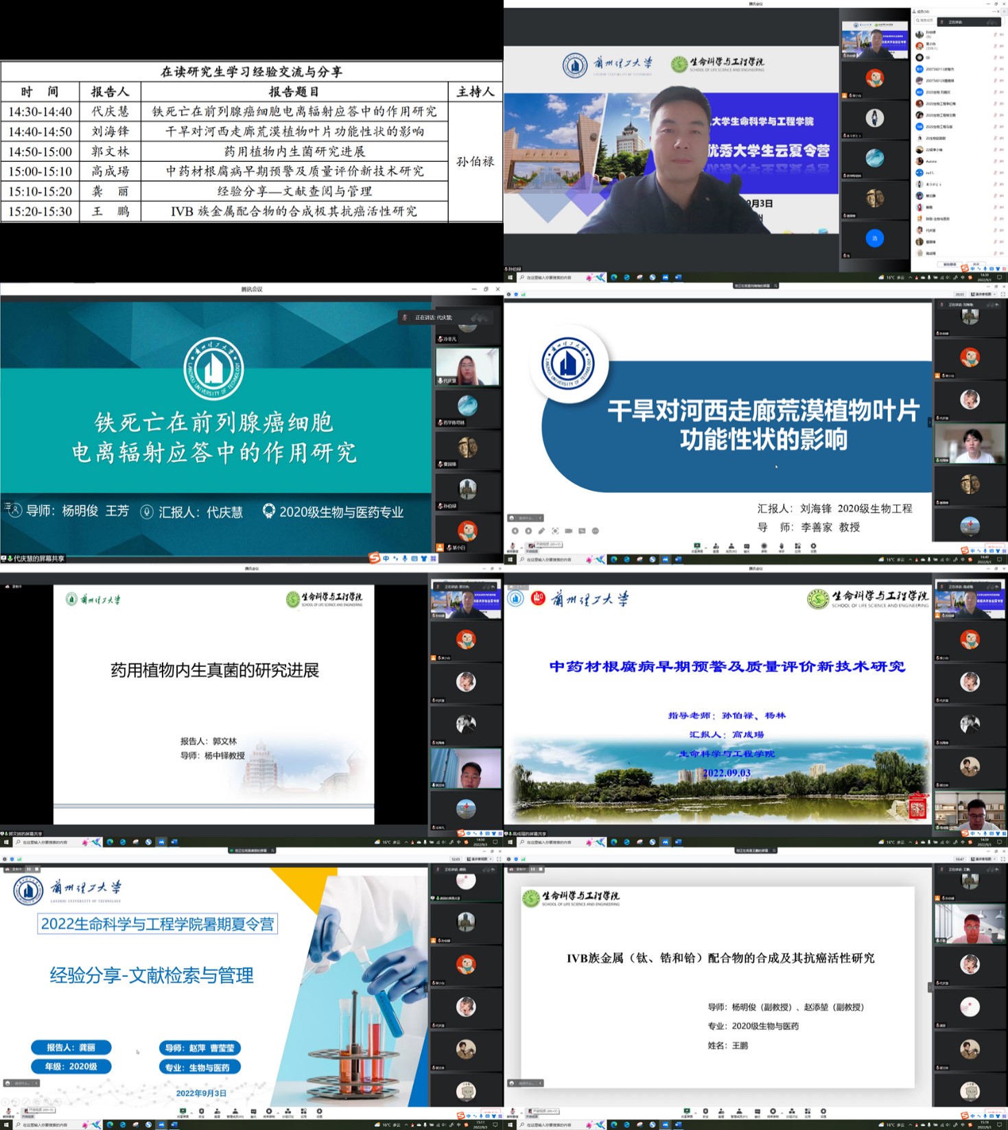 9月3日,兰州理工大学生命科学与工程学院2022年优秀大学生云夏令营通过线上形式举行。生命学院党委书记穆龙,院长伍国强,党委副书记武军莉,副院长任海伟,各学位点负责人和导师代表出席活动。经学院审核筛选,来自兰州理工大学、河西学院等国内兄弟院校的24位优秀大学生参加了夏令营活动。