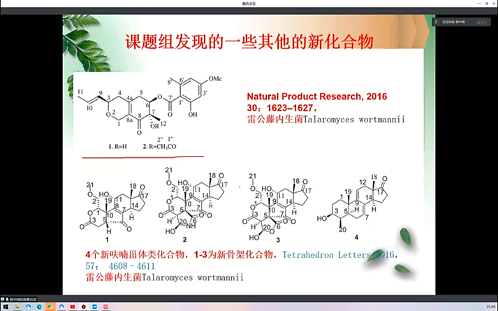 接着,杨中铎教授结合课题组开展的研究工作,做了题为“天然来源的酶抑制剂发现研究”的报告,以阿尔茨海默症(AD)为切入口,从酶的简单介绍开始,介绍了课题组主要关注的乙酰胆碱酯酶抑制剂、单胺氧化酶抑制剂和磷酸二酯酶抑制剂的构效关系及临床用途,并以此为发现新药的靶点,对目前实验室开发的以PDE的TLC生物自显法筛选技术为支撑的藏药毒毛妞中的乙酰胆碱酯酶抑制剂进行了结构改造,并进行了活性分析,做了“跳台实验”和“水迷宫实验”来验证其活性。除此之外,还深入浅出的介绍了课题组从荷叶、百部、路路通等中药材以及两面针、钩藤、雷公藤等内生菌中分离出的一系列酶抑制剂。