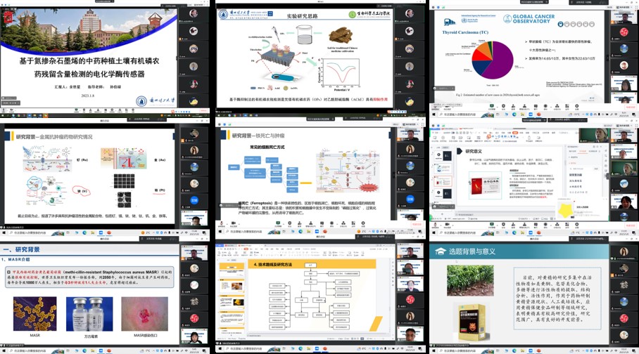 参加汇报的同学们以PPT的形式,将自己的研究课题从研究背景、研究意义、研究目标、研究内容、研究方案、方案可行性与创新型、已做出的成果及预期计划安排进行了详细的阐述。专家组老师结合汇报内容对其中存在的问题做了质询,并给予了建设性的指导意见。