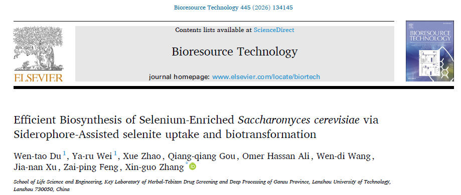 近日,我校生命科学与工程学院西部中藏药资源开发与利用研究团队在生物工程与技术领域著名期刊《Bioresource Technology》(中国科学院一区,TOP期刊,IF=9.0)发表了题为“Efficient Biosynthesis of Selenium-Enriched Saccharomyces cerevisiae via Siderophore-Assisted selenite uptake and biotransformation”的研究论文。生命科学与工程学院制药工程系教授张新国为通讯作者,2023级硕士研究生杜文韬为论文第一作者,兰州理工大学为第一署名单位。
